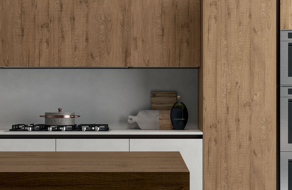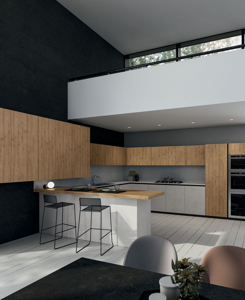 Cucine - Cucine moderne - cucina con gola - Gentili Group - Time gola - melaminico quercia miele - melaminico cemento nebbia - top laminato cemento nebbia
